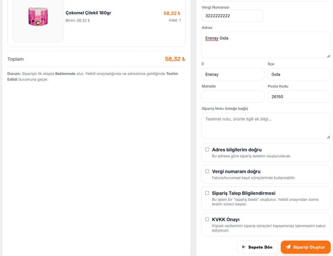 Sepetinize ürünleri ekledikten sonra “Sipariş Oluştur” butonuna tıklayın. Kayıt bilgileriniz otomatik gelir; gerekirse düzenleyebilir veya destekle iletişime geçebilirsiniz.